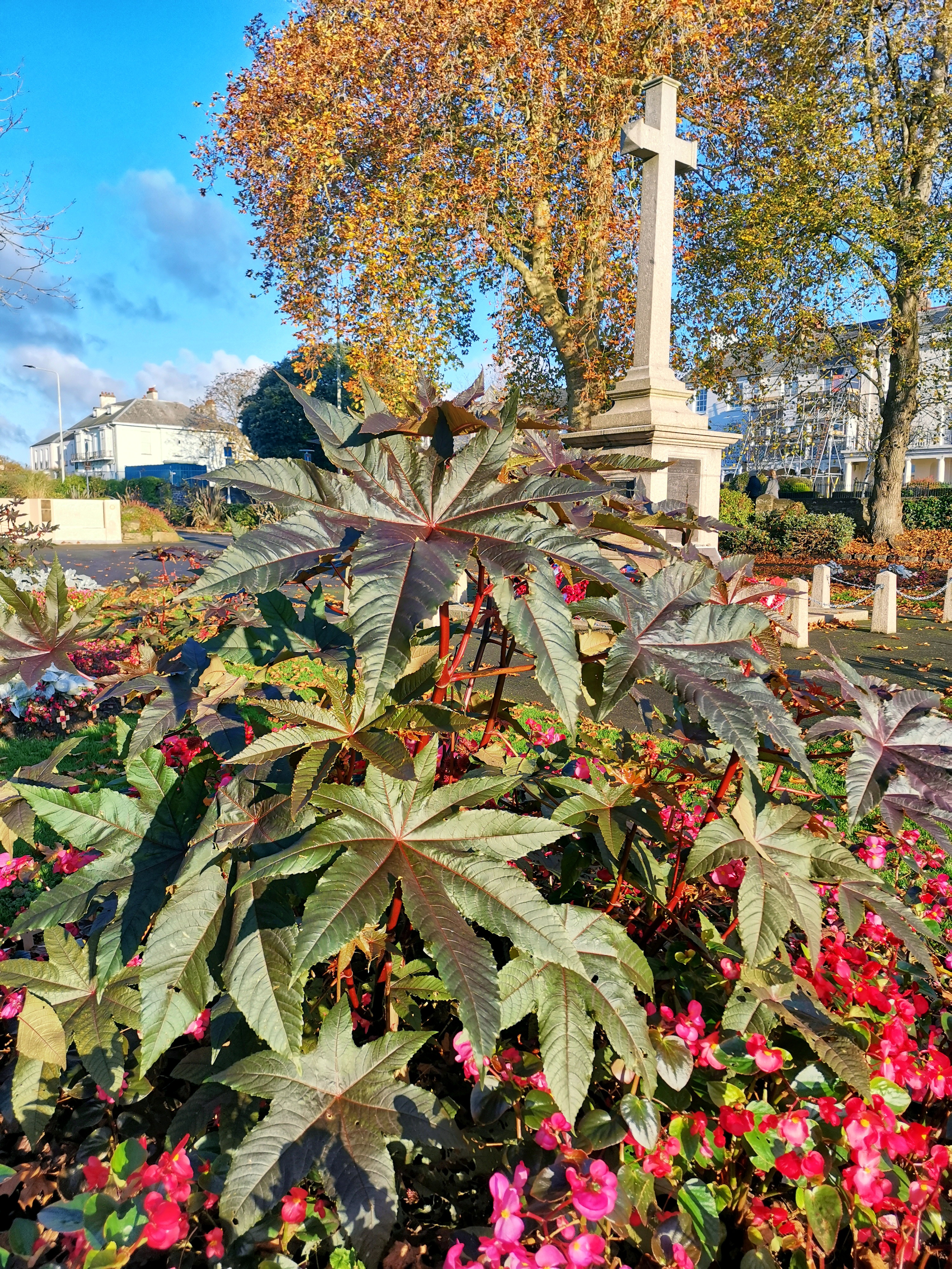 I took a stroll round the park yesterday, just as the morning sun was making everything golden. I found some interesting foliage around the war memorial, along with crisp carpets of leaves in every shade of red, orange and yellow.
