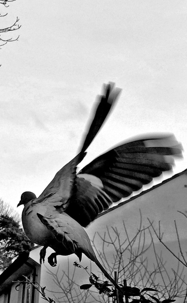 I was sitting in the shed listening to the rain on Saturday when something alighted (heavily) on the roof. I poked my camera over the door frame and… Oops, one startled pigeon.