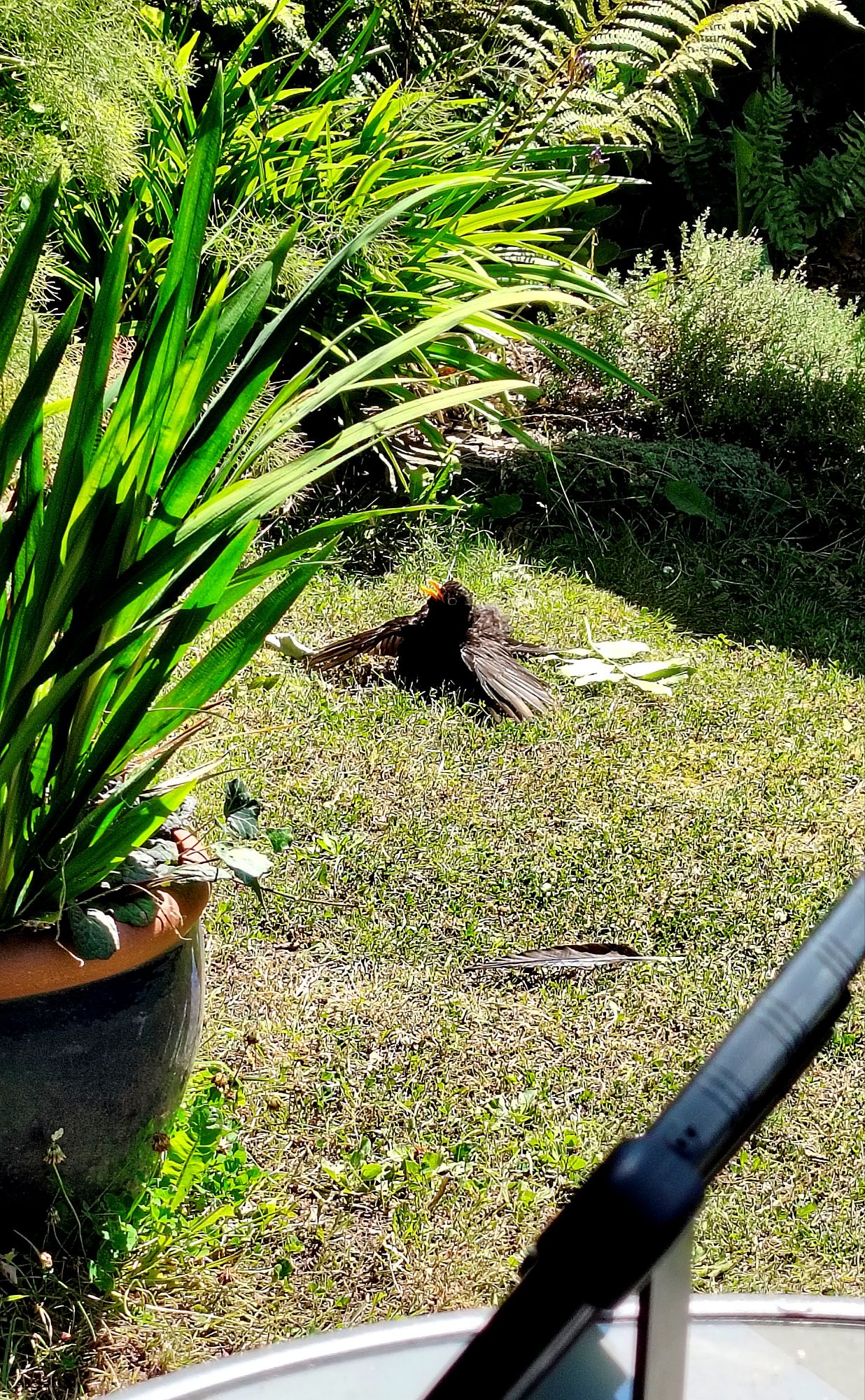 I spent as much time in the garden as I could over the last few days; where the bright orange of day lilies adds to the fiery ambience and I was joined several times by an overheated, panting blackbird.