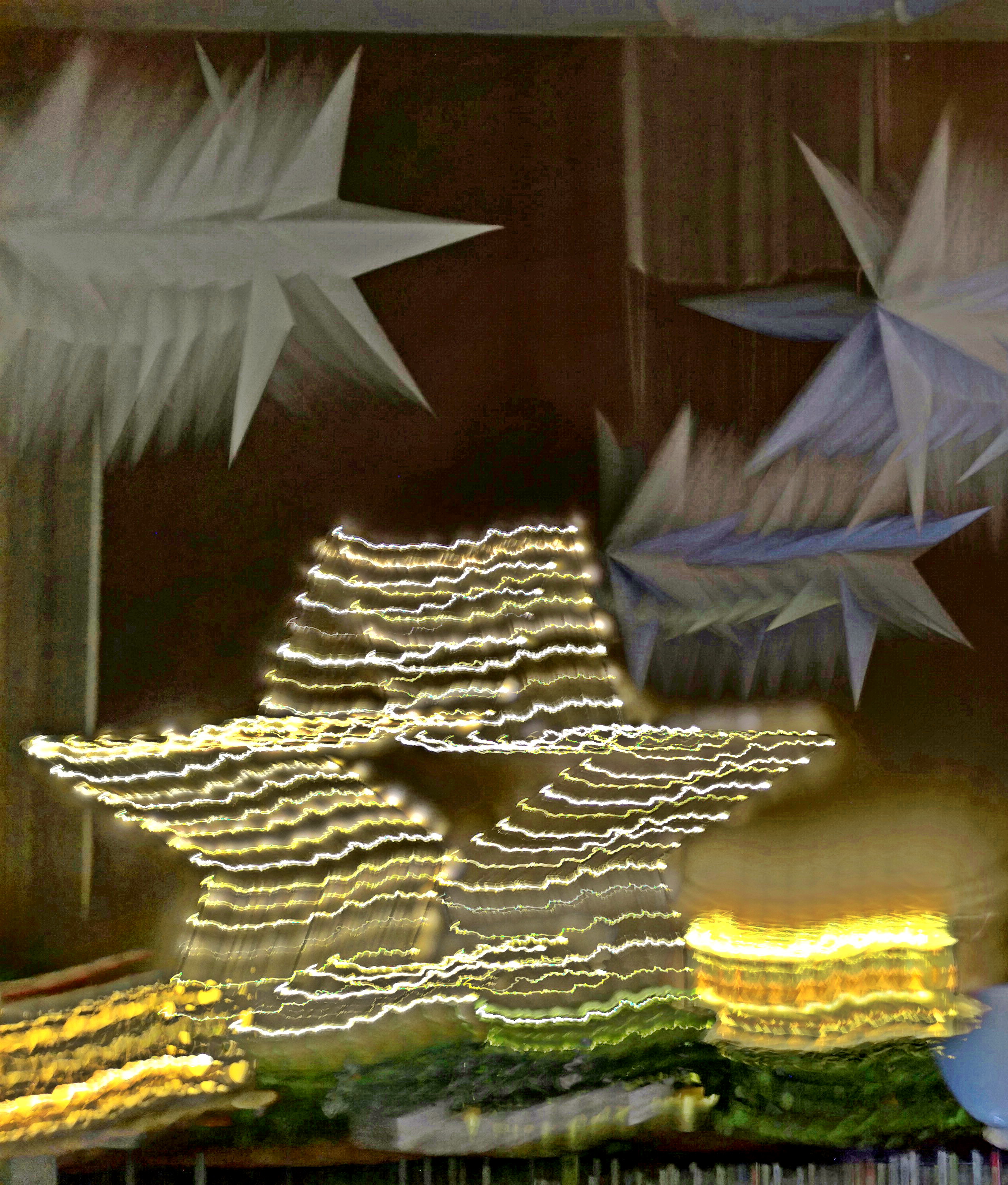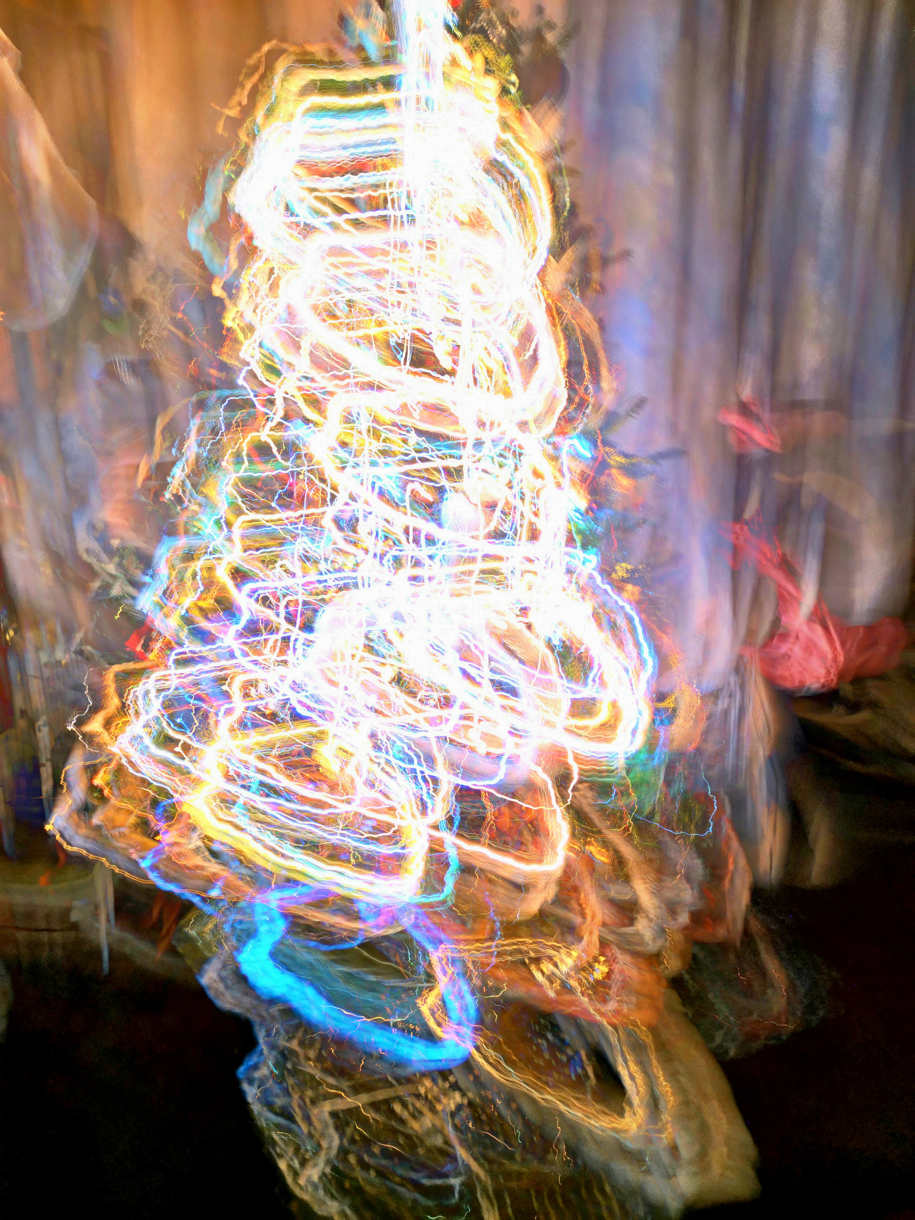For my contribution, here are a few photos of our tree and some illuminated decorations in the dark, with which I did a spot of light painting, inspired by last week’s traffic trails.